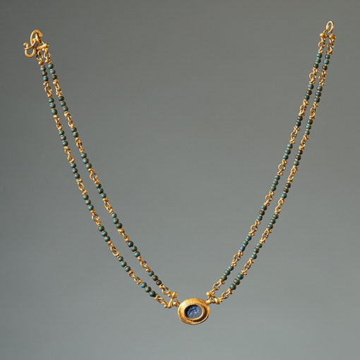 Die Kette aus Doppelreihen von 94 blauen, kugeligen Fritteperlen. Römisches Kaiserreich, 2. - 4. Jh. n. u. Zr. In dem zentralen Hänger eine blaue, revers schwarze Glaspaste mit einem Pferdelehrer n. r. Römische Republik, 2. - 1. Jh. v. u. Zr. Intaglio und Perlen zusammen 4,5 gr. 65,6 gr. 900er Gold