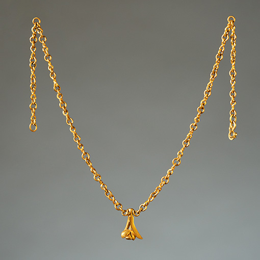 An der Kette aus achtförmig, halbverdrehten Gliedern mit Ringen, als Hänger ein aufgesägter Vierkantdraht. Zwischen blattähnlichen Formen wächst eine „Blüte“ und aus dieser eine kleinere Trichterform. 39,6 gr. 900er Gold