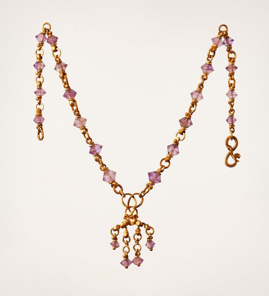 Vierundzwanzig beidseitig konische Amethyst - Perlen aus römischer Zeit in Ägypten. 60,1 gr. 900er Gold