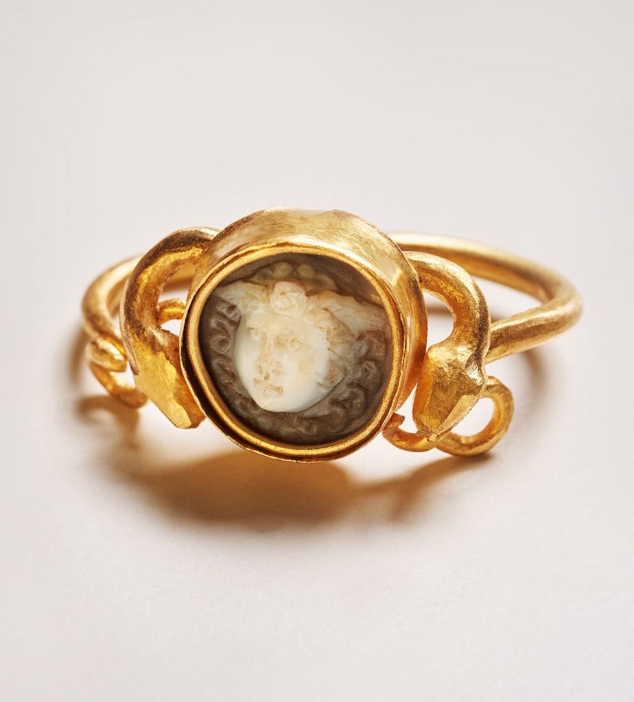 Medusen-Cameo aus Lagenachat von blaugrauem zu bläulichem Weiß. Römisch, 1.- 2. Jh. n. u. Zr. Der Kopf wird von zwei Schlangen gehalten. 38,6 gr. 900er Gold