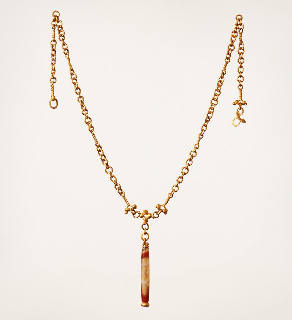 Afghanische Stabperle mit einem weißen Band in der transparenten Mittelschicht und roten Enden. Eine Mischform aus Achat und Karneol, etwa 2500-2000 v. u. Zr. 43 gr. 900er Gold