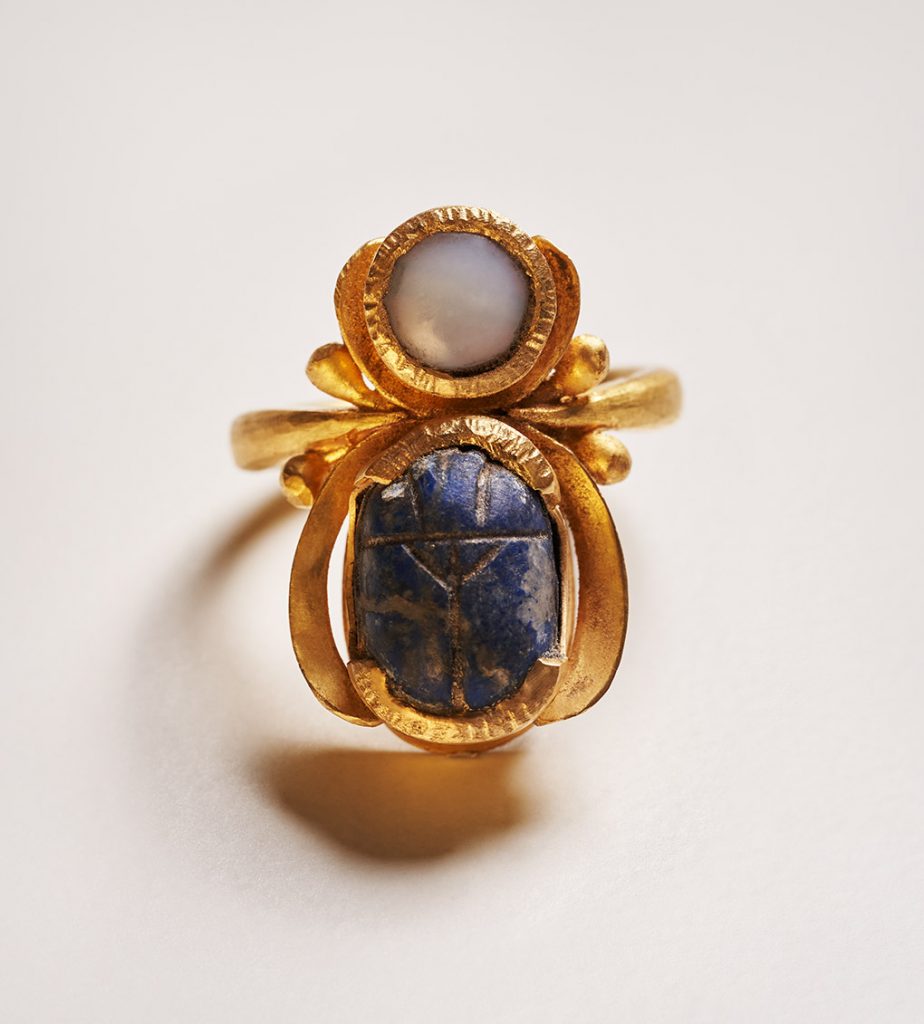 Mit einem Lapislazuli-Skarabäus mit einem Text auf der Unterseite. Aus Syrien etwa 300 v.- Zeitenwende. Darüber ein runder Stein, dessen Oberseite eine Chalcedonschicht ist. 22,6 gr. 900er Gold