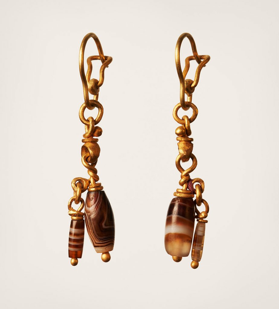 Mit je zwei Bandachat - Perlen von unterschiedlicher Größe aus römischer Zeit in Ägypten, 1.Jh. v.-1. Jh. n. u. Zr. 9,2 gr. 900er und 750iger Gold