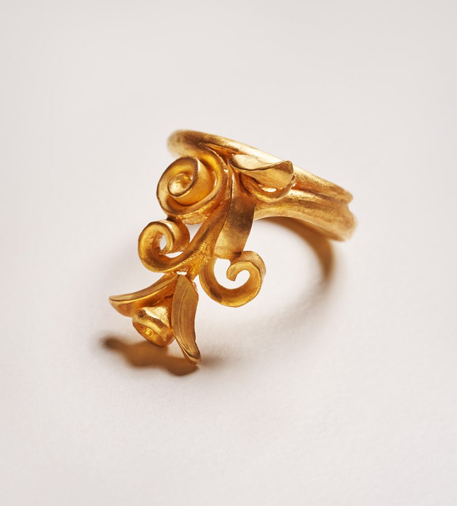 Aus einem Runddraht, beide Enden sind aufgebrochen und dreifach eingerollt. Im Zentrum zwei Blüten, eine davon in der Ringschiene. 20,9 gr. 900er