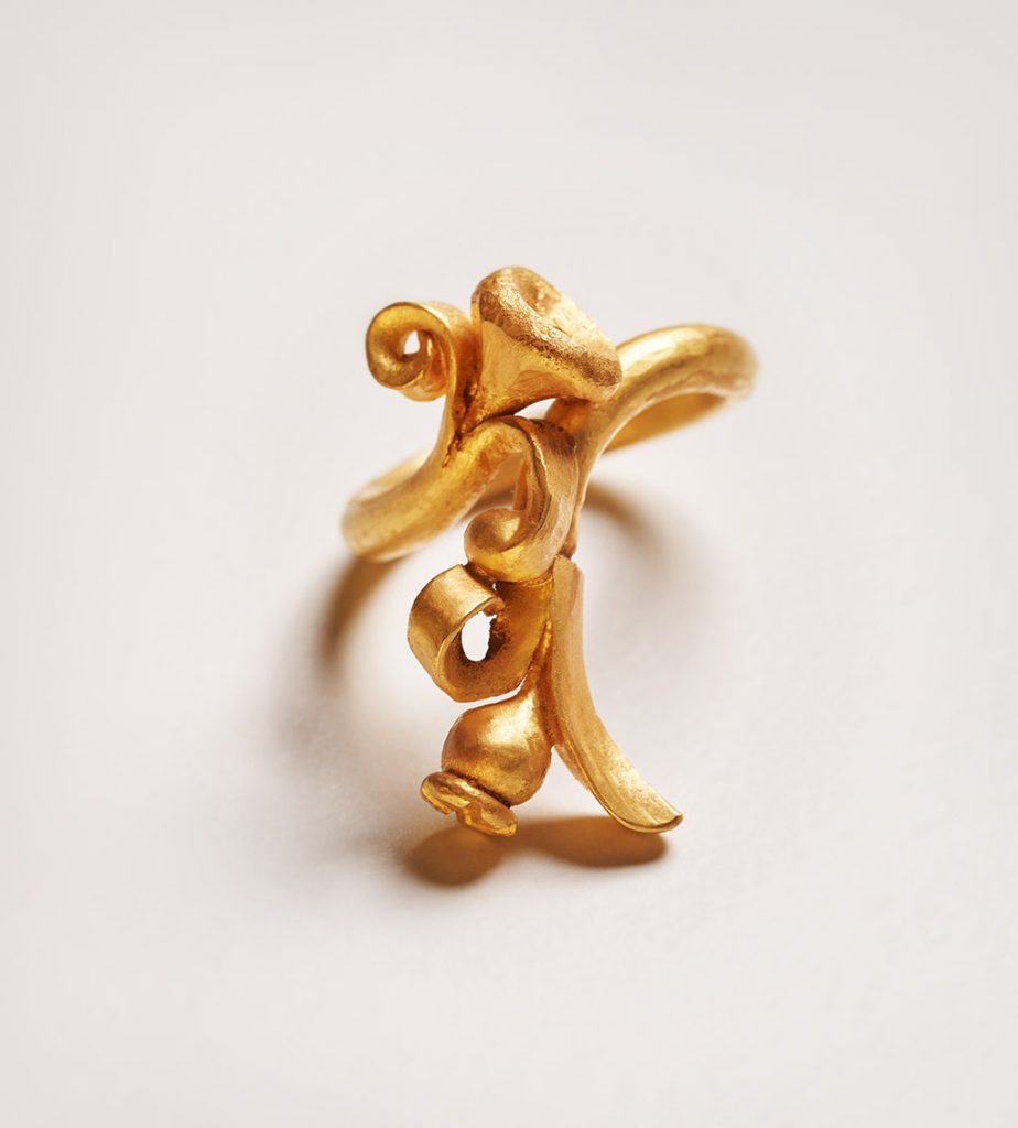 Aus einem einseitig aufgebrochenen Runddraht mit einer Trichterblüte. Dem anderen Ende ist eine Vierkantblattform aufgesetzt, mit einer Mohnkapsel auf der Vierkantbasis. 19,4 gr. 900er