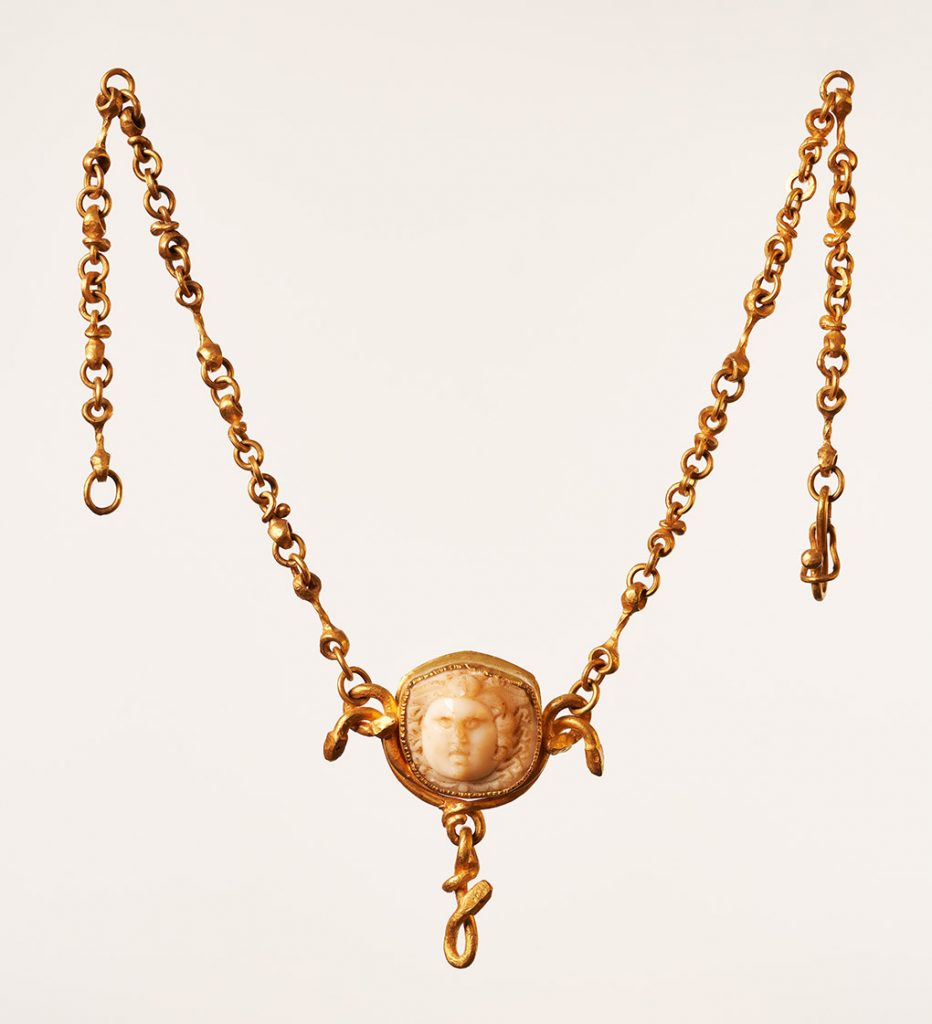 Das Cameo ist römisch aus dem 2. Jh. n. u. Zr. Die Medusa ist von fünf Schlangen umgeben, eine als Hänger. 73 gr. 900er Gold
