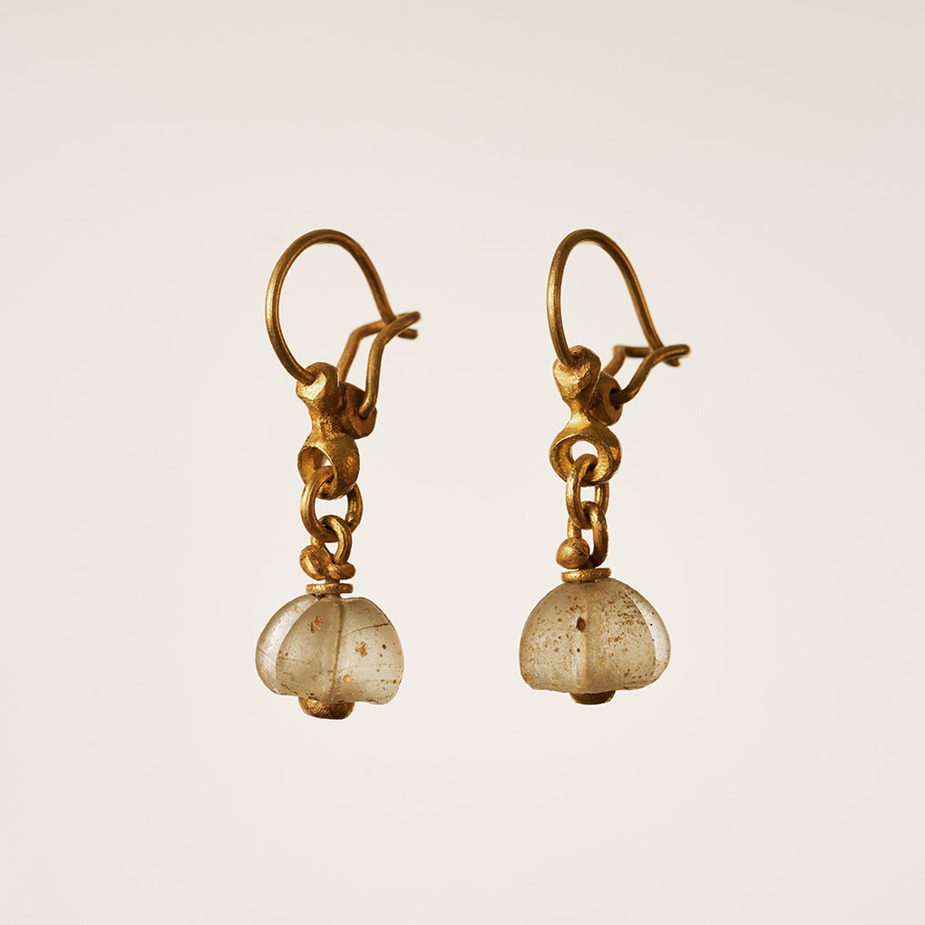 Mit zwei melonenförmigen Glasperlen, frühislamisch um 600 – 800 n. u. Zr. 8,2 gr. 900er und an den Bügeln 750er Gold
