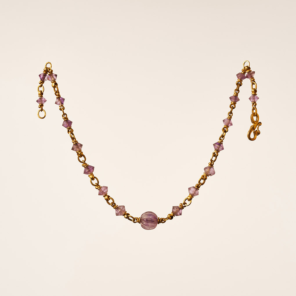 Im Zentrum eine geriefte, größere und in der Kette achtzehn kleinere linsenförmige Amethystperlen. Diese sind aus späthellenistisch – römische Zeit. 46 gr. 900er Gold