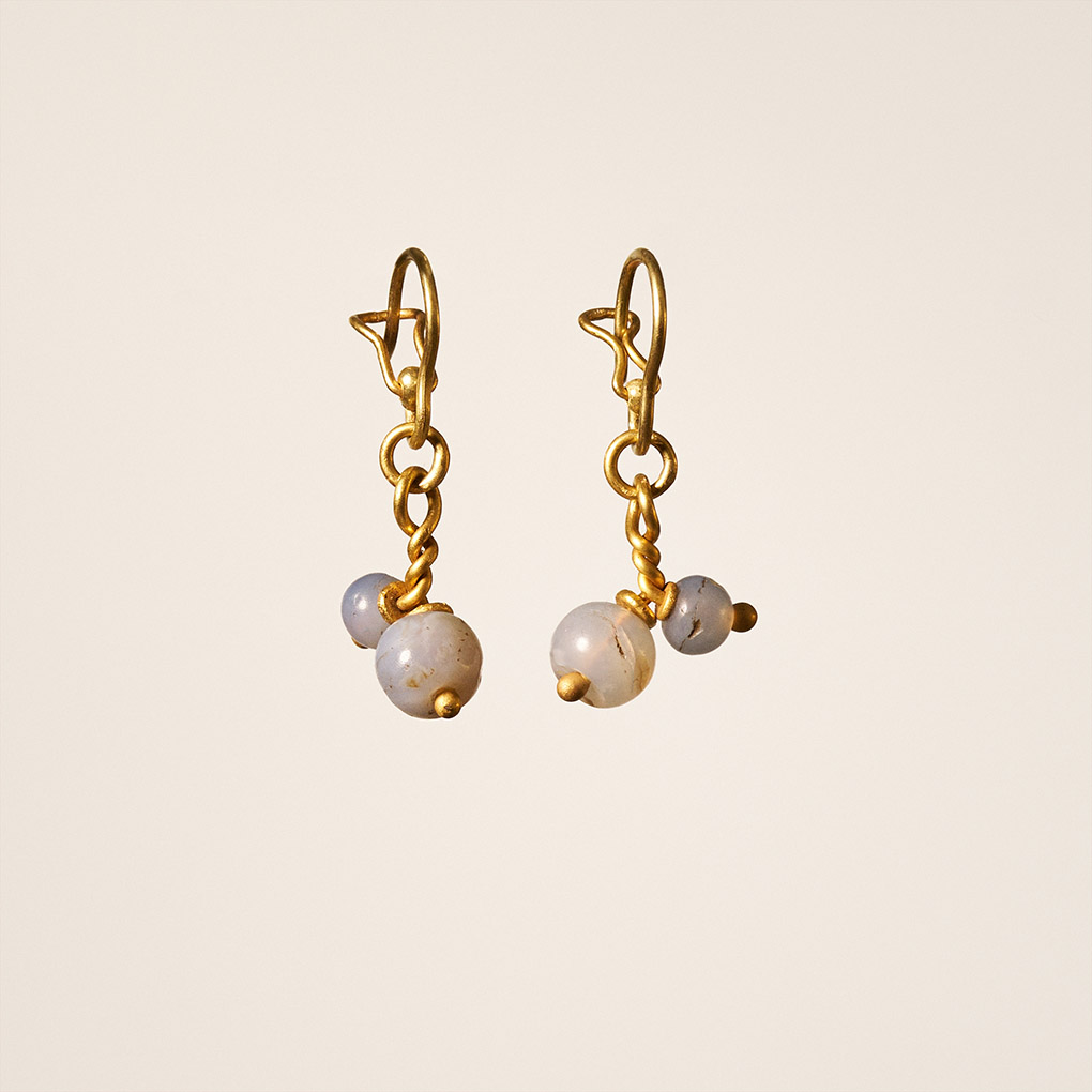 Mit je zwei unterschiedlich großen Chalcedonperlen aus Amlasch am kaspischen Meer, ca. 1000 v. u. Zr. 6,2 gr. 900er und an den Bügeln 750iger Gold