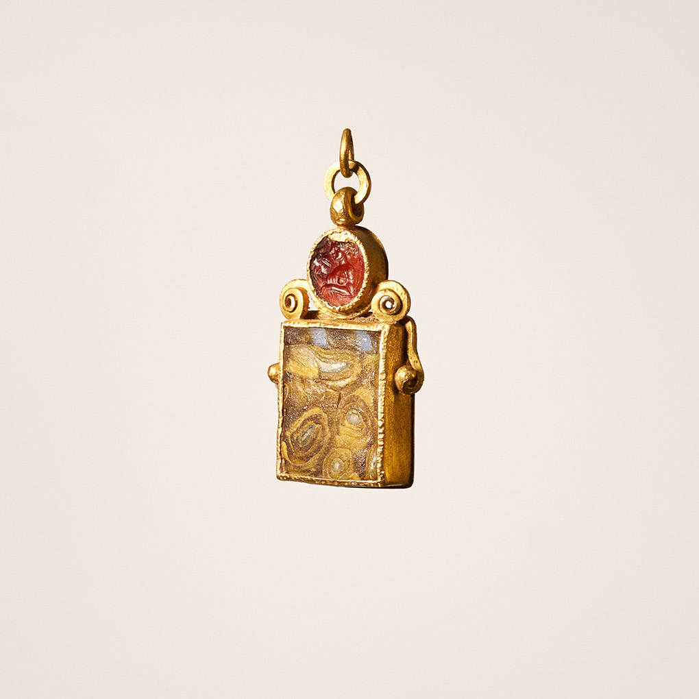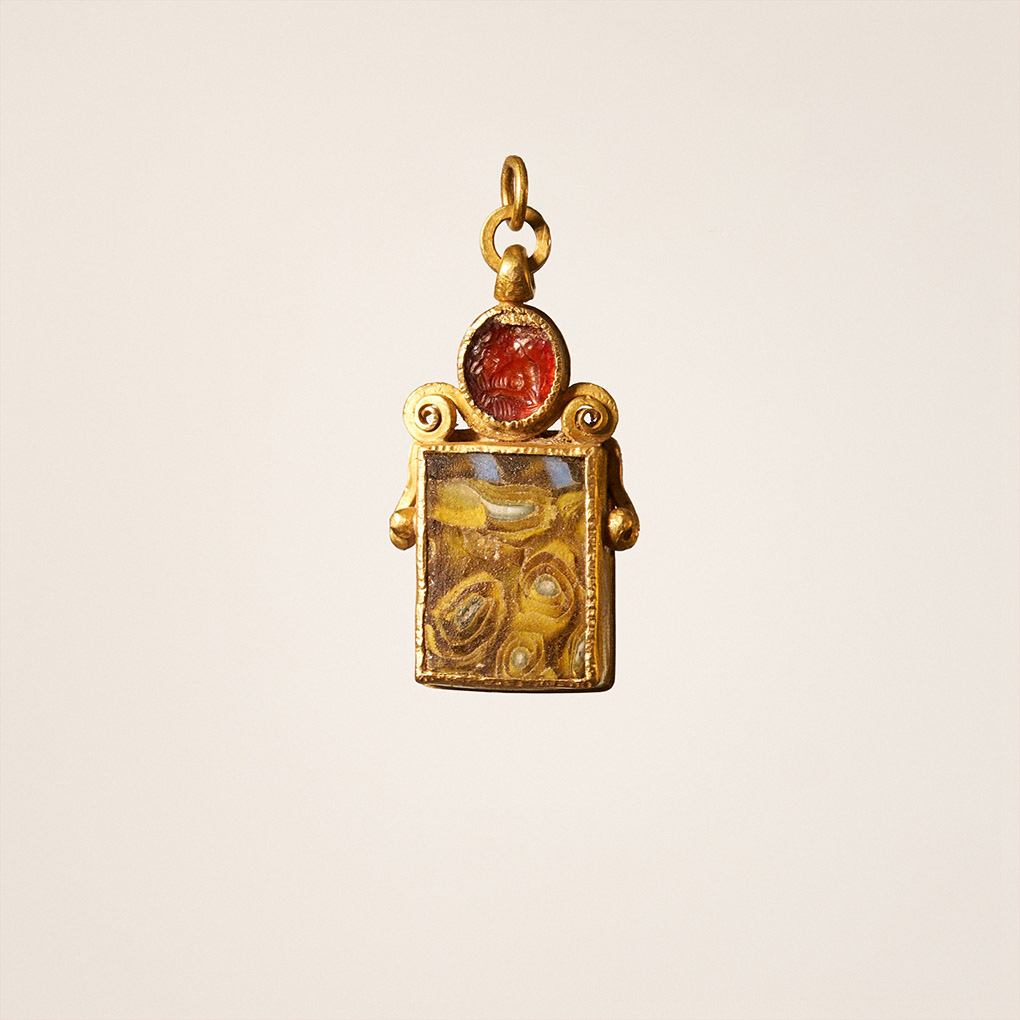 Mit einer Karneolgemme, römisch 1. Jh. v-1. Jh. n. u. Zr. Die Büste einer jungen Frau oder Göttin, die an einem Blumenstrauß schnuppert. Der meisterhaft geschnittene Stein ist oberhalb ihres Gesichtes beschädigt und mit Gold ergänzt. Darunter eine gewölbte Becherscherbe mit gelben, aufsteigenden Röhren aus Ägypten, gleiche Zeit wie die Gemme. 12,7 gr. 900er Gold